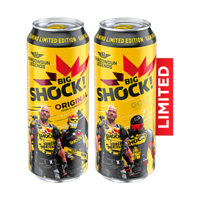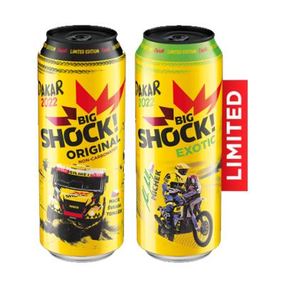 Energy nápoje Big Shock! dodáváme na trh od roku 2003. Svým složením s nejvyšším povoleným množstvím přírodního kofeinu, taurinu a celou řadou skvělejch vitamínů dodávaj tu správnou dávku energie. Balení v 330ml a 500ml plechu Ti hravě padne do packy. Pro náročnější pijany máme PETky a pro požitkáře tyčinky nebo cukry.